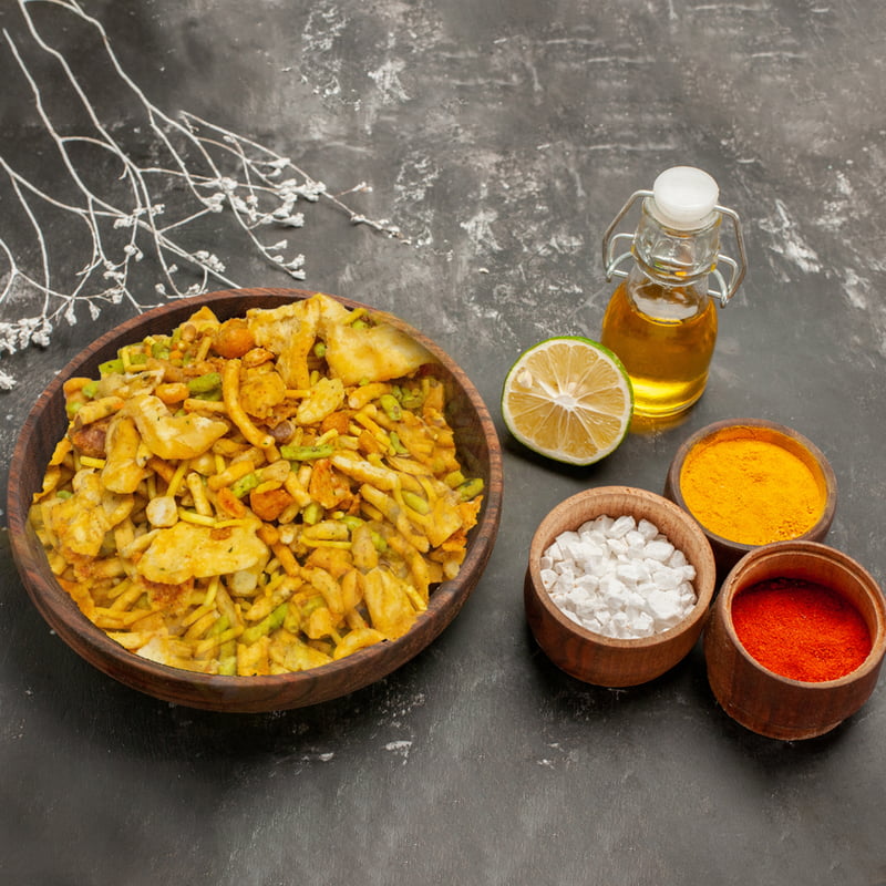 | Ingredients: Flour, spices, oil, lentils, sev, peanuts. Description: A savory blend of crunchy Nimki, spiced sev, and fried lentils, this mixture is the perfect snack to satisfy your spicy and salty cravings. Its balance of flavors and textures makes it ideal for snacking at any time. |